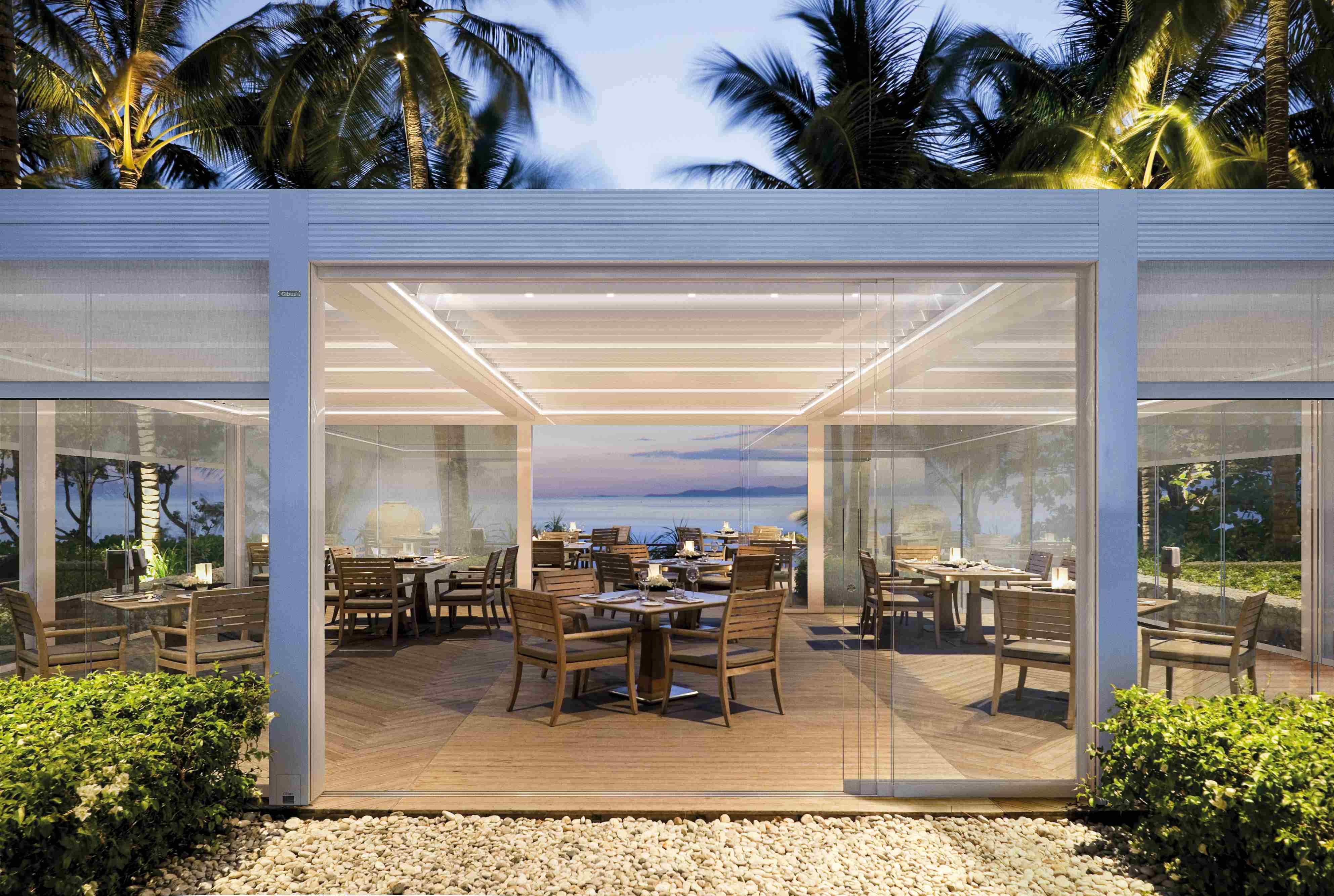 The Med Varia Outdoor Waterproof Awning incorporates awnings and glass walls for protection against any sort of weather and to ensure privacy. Motorised slats protect your paraphernalia from unpleasant weather and adjust the light intensity during the evening. When night comes the fitted LED lights create a magical setting and the heating accessories will guarantee that you will stay warm and cosy.